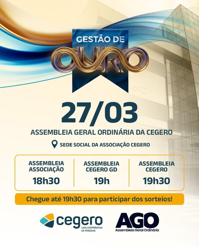 Uma boa notícia para os associados da Cegero: quem participar das Assembleias Gerais Ordinárias da Cooperativa de Eletricidade de São Ludgero (Cegero), da Cooperativa de Geração e Desenvolvimento de São Ludgero (Cegero GD) e da Associação Social e Recreativa Cegero (Associação Cegero), no dia 27 de março (sexta-feira), a partir das 18h30min, na sede social da Associação Cegero, estará concorrendo ao sorteio de três scooters e dez vale-compras no valor de R$ 1.000,00 cada.