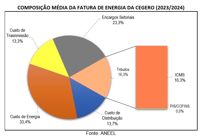 A tarifa de energia é composta de custos da geração, transmissão e distribuição de energia, além de encargos e tributos. Quando a conta chega, o consumidor paga pela compra da energia (custos das empresas geradoras), pelo transporte da mesma (custos das empresas de transmissão de energia), pela distribuição (parte que cabe à Cegero) e pelos encargos setoriais e tributos. Portanto, no valor da fatura de energia paga pelo consumidor: