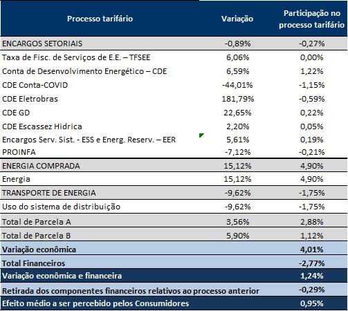 O efeito médio do reajuste a ser percebido pelos consumidores será de 0,95%. Para os consumidores faturados em Baixa Tensão o efeito médio será de 2,73%, sendo de 2,68% para os consumidores residenciais. Já para os consumidores faturados em Alta Tensão o efeito médio será de 0,23%.