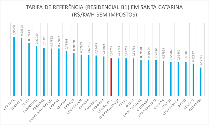 De forma a demonstrar de maneira prática a aplicação das tarifas, a seguir apresentamos a aplicação da tarifa B1 residencial (tarifa de referência) praticada pela Cegero, comparando-a com a tarifa média nacional. Ambas as tarifas sem o acréscimo de bandeiras tarifárias e ICMS.