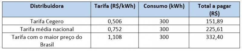 De forma a demonstrar de maneira prática a aplicação das tarifas, a seguir apresentamos a aplicação da tarifa B1 residencial (tarifa de referência) praticada pela Cegero, comparando-a com a tarifa média nacional. Segue também uma comparação com a maior tarifa praticada entre as 105 distribuidoras do Brasil. Ambas as tarifas sem o acréscimo de bandeiras tarifárias.